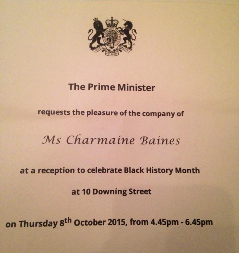 Charmaine Baines 10 Downing StreetCharmaine Baines will visit 10 Downing Street on Thursday 8th October 2015 after being nominated by Staffordshire Chambers of Commerce to attend this unique reception to celebrate Black History Month hosted by the Prime Minister, David Cameron. Charmaine was nominated for her work with her community youth music and radio project, www.iwysmusic.co.uk