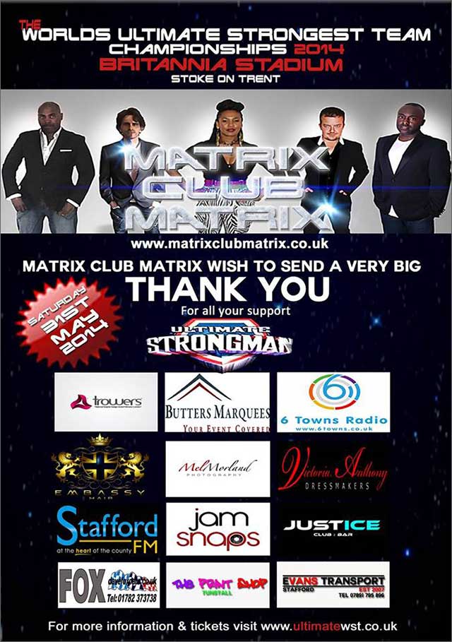 Matrix Club Matrix wish to say a very very big thank you to all who have supported us preparing to perform at ‘The Worlds Ultimate Strongest Team Championships at Britannia Stadium, Stoke on Trent. We are over the moon. Many thanks to Eddie Hall for giving us this opportunity.